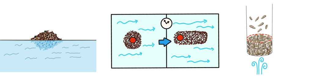 How they form rafts is always a question that puzzles researchers. Fire ants are virtually blind and swim very poorly on the water surface. They can’t see a mate from far away on the water surface and actively congregate. By experimenting with rafts of different sizes, I found something remarkable: small rafts are in fact unstable! Ants are in fact attracted to each other through surface tension, the same mechanism that draws cheerios on the milk surface together. This attraction scales favorably with the number of individual. It is only strong enough to hold a raft together when the raft is large.